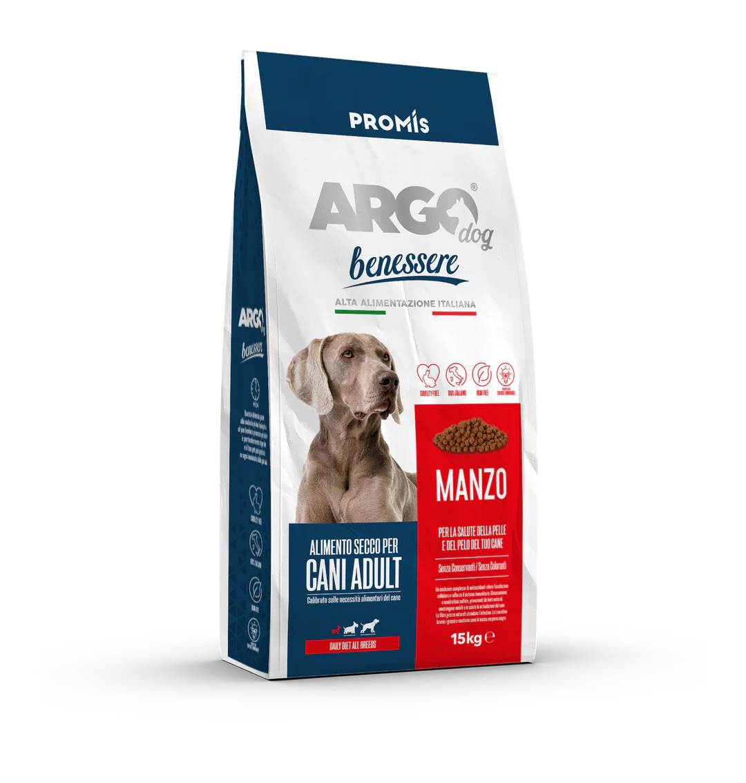 מזון פרמיום מלא לכלבים מבוגרים או כלבים בעלי נטייה להשמנה בכל הגדלים על בסיס בשר בקר – Argo Benessere