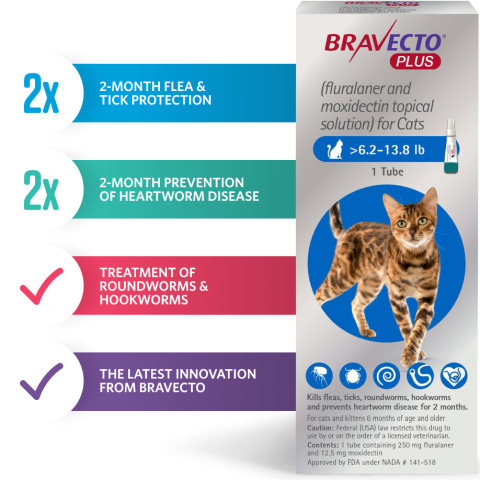 BRAVECTO PLUS מספק הגנה מפני פרעושים, קרציות ותולעי לב למשך חודשיים, וכן מטפל בתולעים עגולות ותולעי וו.