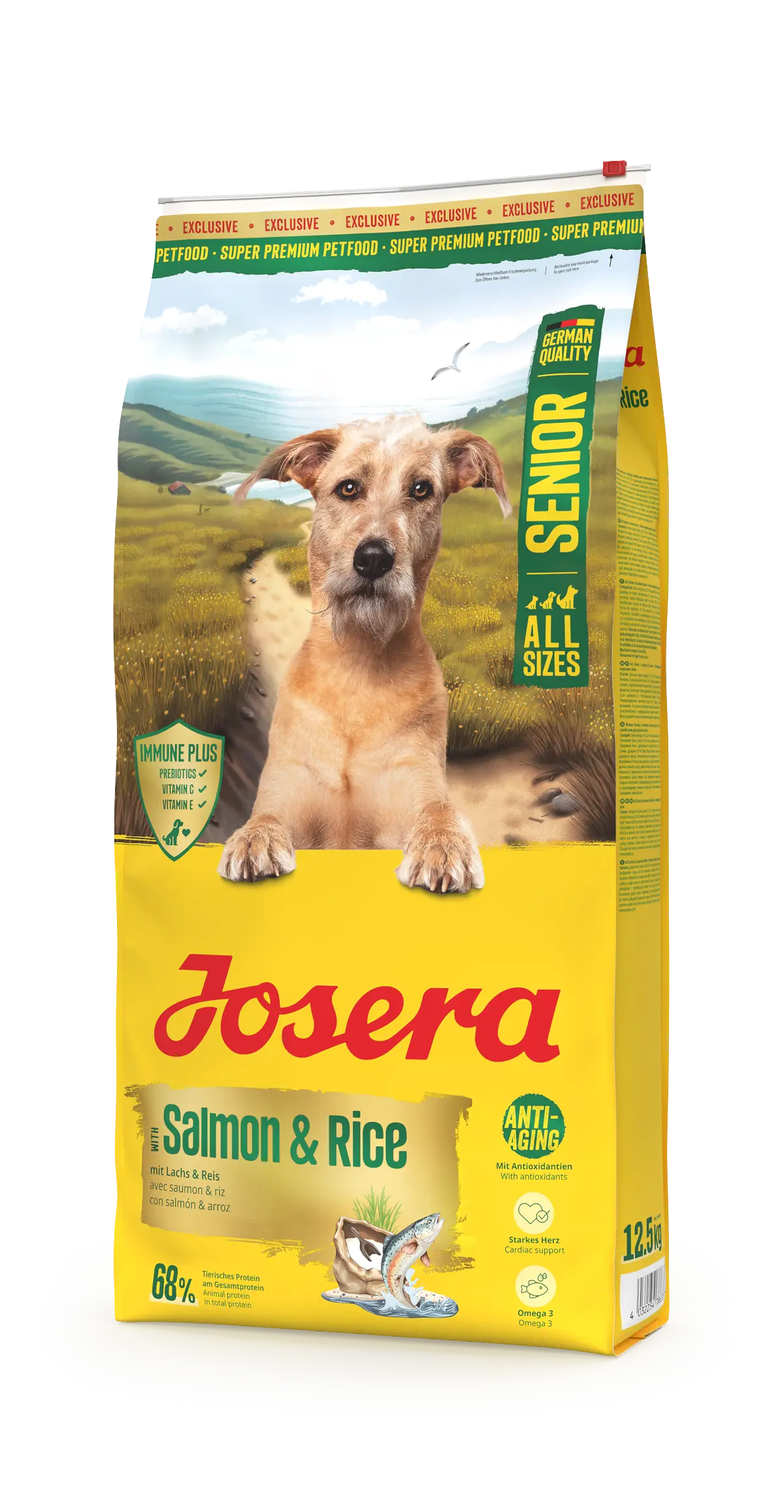 לכלבים מבוגרים, טווח המוצרים שלנו כולל כעת את הסלמון והאורז החדש של Josera Senior Salmon: המתכון למזון זה לכלבים מבוגרים עוצב במיוחד בהתאם לצרכיהם החדשים. הוא דל בשומן ויכול למנוע השמנת יתר. במקביל, ירידה בתכולת החלבון והמינרלים מפחיתה את העומס על האיברים. שמן סלמון נוסף מספק את חומצות השומן האומגה-3 היקרות DHA ו-EPA: לאלו תכונות אנטי-דלקתיות, מה שמעניק להן תפקיד חשוב בגוף חיית המחמד שלך. נוגדי חמצון יקרי ערך כמו ויטמין E, ויטמין C וטאורין נלחמים בהזדקנות תאים, בעוד L-קרניטין מסייע במניעת אובדן שריר הקשור לגיל. בנוסף, Josera IMMUNE PLUS מקדם מערכת חיסון בריאה אצל חבר בעל ארבע רגליים. ה-SeniorPlus שלנו נקרא כעת Senior Salmon & Rice: העיצוב החדש מוסיף IMMUNE PLUS למתכון המנוסה והמוכר. *ג’וסרה אימוני פלוס דפנות תאי השמרים עשירות בגלוקנים ומאננים (MOS), שיש להם אפקט פרה-ביוטי ולכן יכולים לתמוך במערכת החיסון. נוגדי חמצון חשובים, כמו ויטמינים C ו-E, מסייעים להרחיק רדיקלים חופשיים.