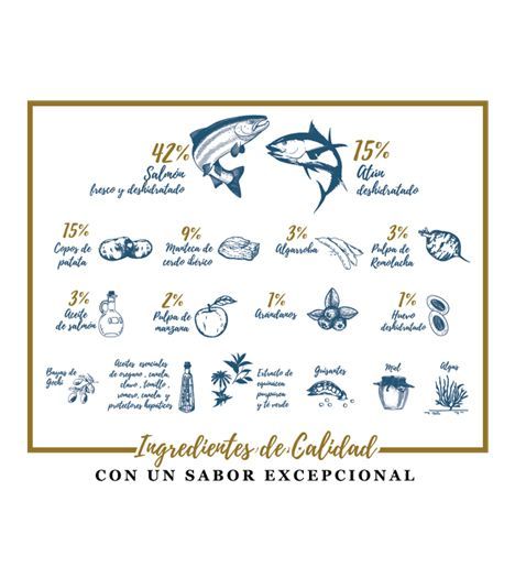 סלמון טרי 21%, סלמון מיובש 21%, פתיתי תפוחי אדמה 15%, טונה מיובשת 15%, שומן חזיר איברי 9%, שמן סלמון 3%, עיסת סלק 3%, עיסת תפוח 2%, אוכמניות 1%, ביצה 1%, אפונה, אצות, פירות גוצ'י, דבש, אורגנו, קינמון, ציפורן, טימין, רוזמרין, תה ירוק, אכינצאה פורפוריאה, מגני כבד (קוץ חלב, בולדו ושמן קמלינה), שמנים אתריים של אורגנו, קינמון, ציפורן, טימין, רוזמרין, אכינצאה סגולה, תה ירוק, מגני כבד (קוץ חלב, תמצית יוקה שידיגנה, בולדו ושמן קמלינה), אבקת דבש, מגני מפרקים (כונדרויטין סולפט, קולגן וגלוקוזאמין), שמרים, ויטמינים, משפרי עיכול (אוליגוסכרידים מנאן (MOS), פרוקטו-אוליגוסכרידים (FOS)), יסודות קורט וחומרים משמרים טבעיים.